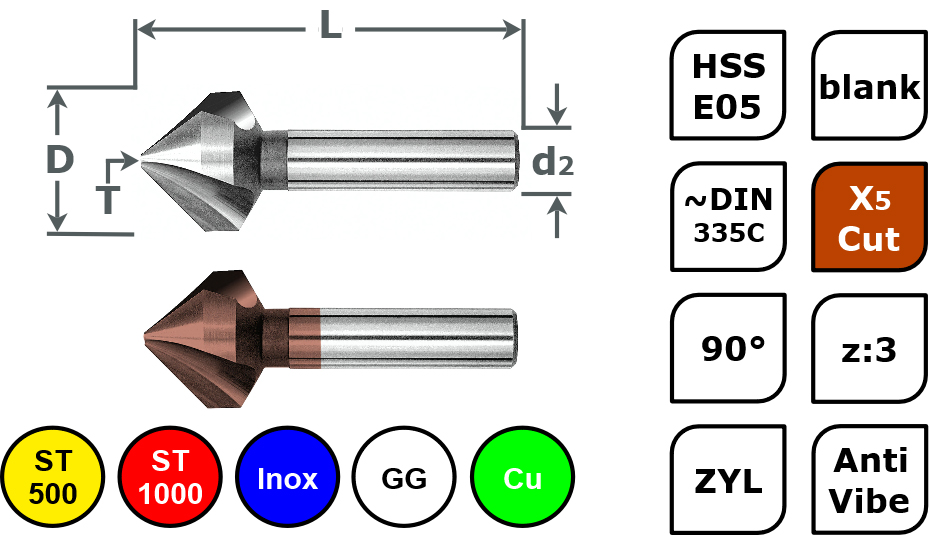 Produktinformationen "Anti Vibration Kegelsenker aus HSS-E05 - Ungleiche Teilung, X5 Cut beschichtet"