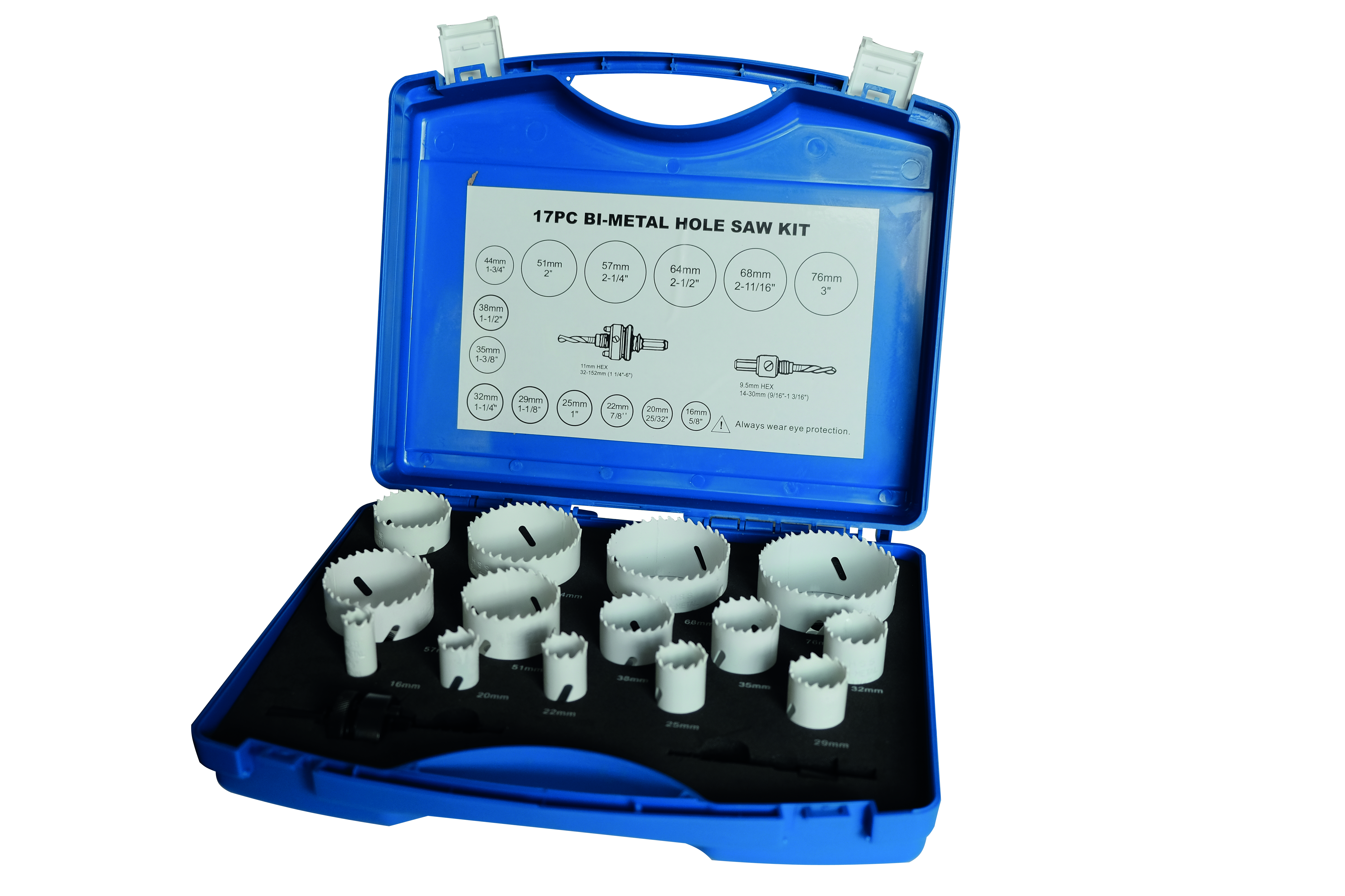 - 14-pieces: ELEKTRO, in plastic magazin, fi lled with: Ø 16 / 20 / 22 / 25 / 29 / 35 / 44 / 51 / 64 / 68 and 76 mm incl. 2 arbor holders in Size 14 - 30 mm and 32 - 210 mm, hexshank, shank-Ø 9,5 und 11mm and ejector spring