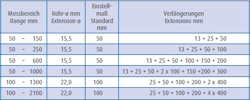 Genauigkeit ± (3 + n + L/50) μm, n = Anzahl der Verlängerungen, L = max. Messbereich